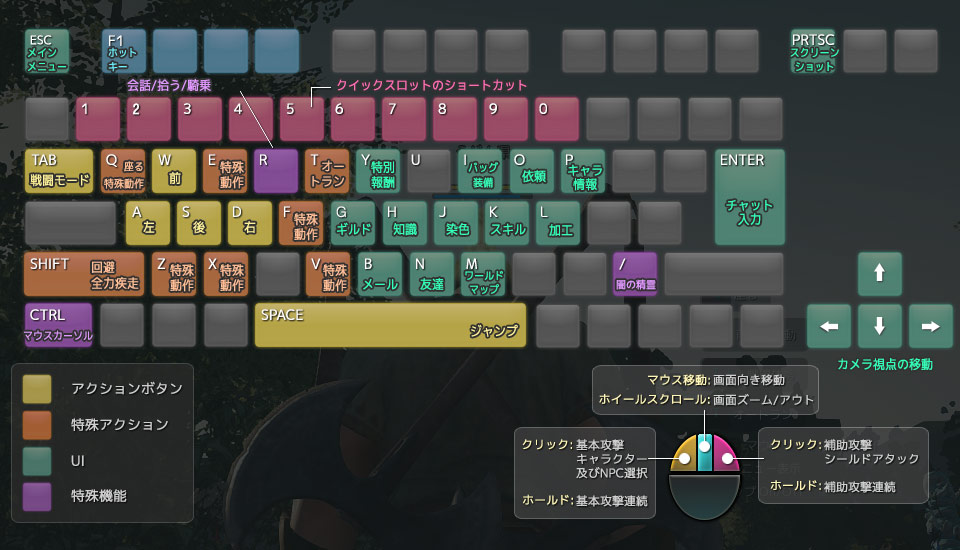| Shift | 早歩き(自動移動中に押しても効果発生) |